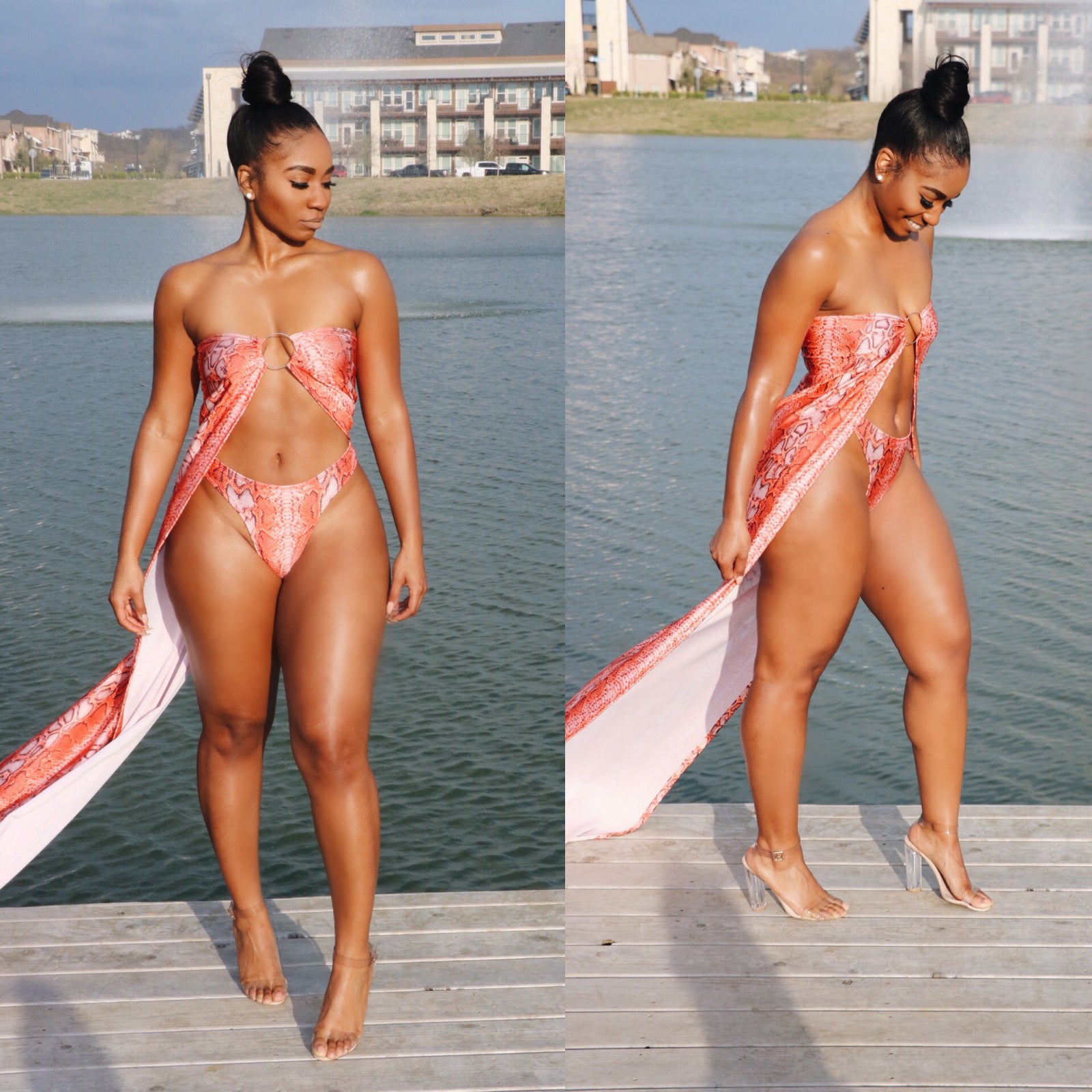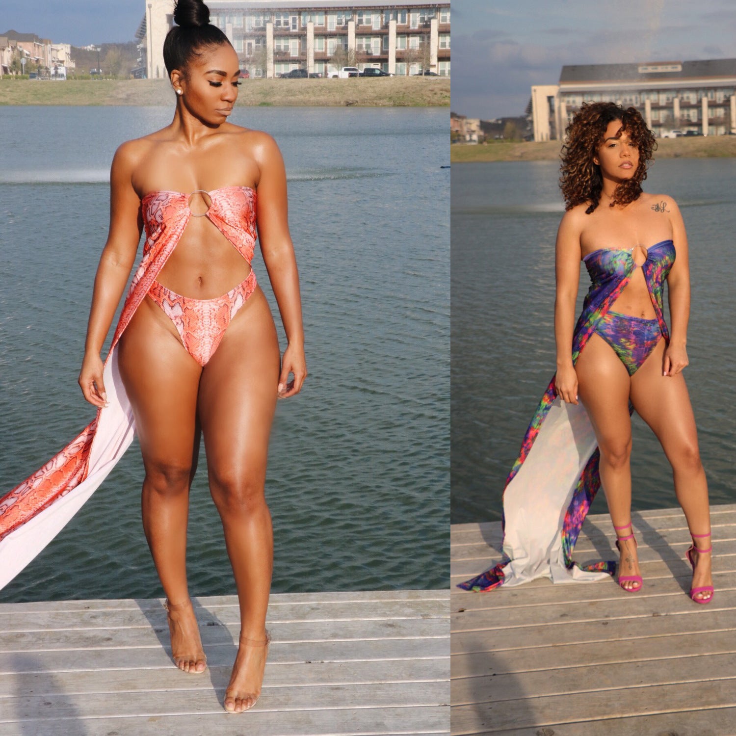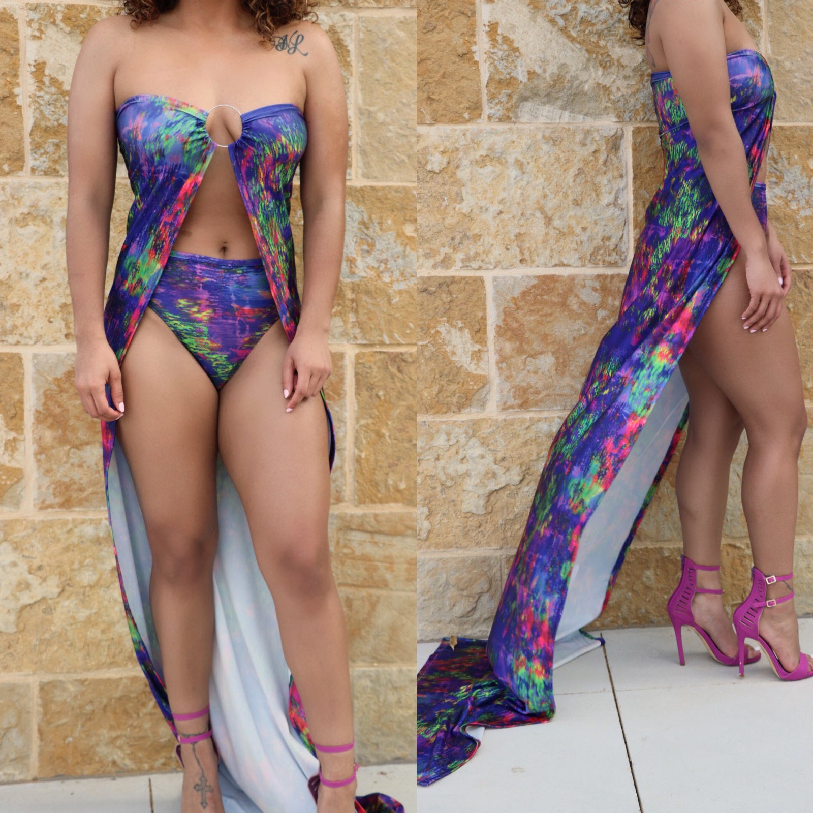 Printed tube top swimsuit with a long tail
