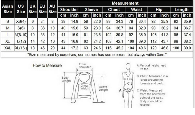 1. Asian sizes are 1 to 2 sizes smaller than European and American people. Choose the larger size if your size between two sizes. Please allow 2-3cm differences due to manual measurement.